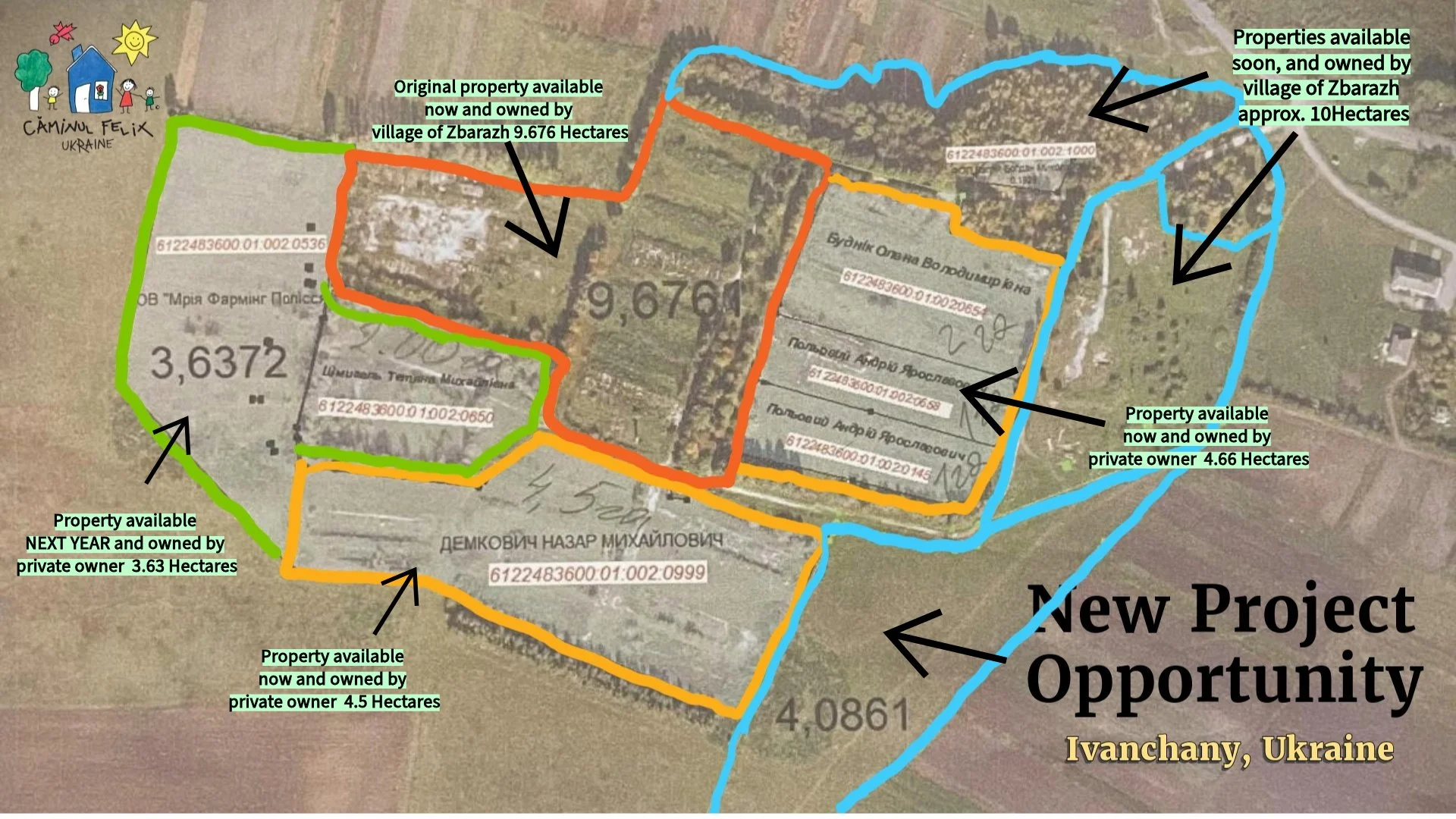 Progress continues in our quest to build a Caminul Felix Village in Ukraine! As I reported last time, we have found the property we are interested in buying and we are now taking the steps necessary to make this dream a reality. You can see in the photo below the land we intend to purchase (note the orange and yellow lined areas as the first part to buy). These parcels combine to equal about 20 hectares, which is just under 50 acres.